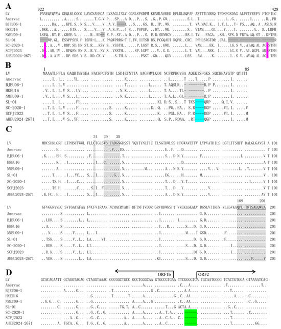 To determine the genomic feature of the new PRRSV-1 isolate, the complete genome of AHEU2024-2671 was identified. The AHEU2024-2671 genome is 15,074 bp in length excluding the poly (A) tail. The genome sequence of AHEU2024-2671 has been deposited into the GenBank database with the accession number PQ640355. In addition, ORF5 sequencing confirmed that the other two PRRSV-1-positive clinical samples contain nearly identical viruses to AHEU2024-2671 (100% ORF5 identity). As shown in Table 3, the AHEU2024-2671 isolate only shared 86.67% and 84.06% genome similarities with the representative LV strain and the predominant BJEU06-1 isolate in China, respectively. Noticeably, the AHEU2024-2671 isolate had the highest genome homology (90.67%) with the SC2020-1 isolate. Each fragment comparison showed that nsp2TF and GP3 are the most variable nonstructural and structural proteins, respectively. As shown in Figure 4, multiple nsp2 alignment showed that the AHEU2024-2671 isolate had the same single amino acid (aa) deletions at 324 and 423 positions as SC2020-1 and SCPJ2023 isolates (Figure 4A). In addition, a 4-aa deletion was also identified at 64–67 positions within the GP3 and GP4 overlap regions of the AHEU2024-2671, SL-01, SC2020-1 and SCPJ2023 isolates (Figure 4B). Moreover, 31 aa substitutions were observed in GP5 of the AHEU2024-2671 isolate when compared with the LV strain, including 2 aa mutations (S194P and A201V) within a B-cell epitope (189–201 aa) (Figure 4C). Remarkably, here, we also identified for the first time that there is a 6 nt deletion between ORF1b and ORF2 genes in the genomes of AHEU2024-2671, SC2020-1 and SCPJ2023 isolates (Figure 4D).