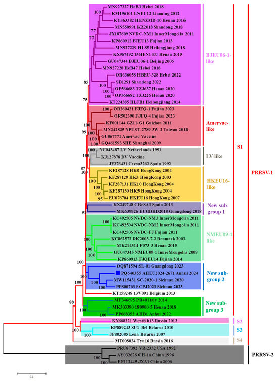 To evaluate the evolutionary relationships between the AHEU2024-2671 isolate and other PRRSV-1 isolates, a genome-based phylogenetic tree was constructed (Figure 5). In addition to the previously described five subgroups, including LV-like, Amervac-like BJEU06-1-like, HKEU16-like and NMEU09-1-like isolates, recent Chinese PRRSV-1 isolates were also clustered within three new subgroups. The AHEU2024-2671 isolate was grouped with SC2020-1, SL-01 and SCPJ2023 isolates, forming a new subgroup 2 within subtype 1 of PRRSV-1 (Figure 5).