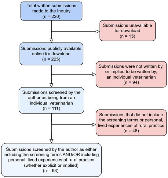 Selection criteria were then applied to the dataset, which aimed to only include submissions that appeared to be written by individual veterinarians describing experiences in rural practice, as these were more likely to provide insight into lived experiences (Figure 1). For the purposes of this study, the terms ‘rural’ and ‘regional’ are used to describe areas outside of major metropolitan areas in NSW, Australia. This is in line with the government’s usage of the terms in the Inquiry [].