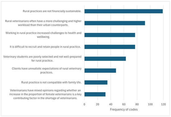 A total of 63 written submissions met the inclusion criteria. The submissions ranged from 70 to 10,094 words in length, with a total of 102,264 words. We described eight major themes, which all related to a central theme of ‘Rural veterinary practice: it’s already hard and it’s nearing impossible’ (see Figure 2). The frequency of codes attributed to each of the themes was also recorded (see Figure 3).