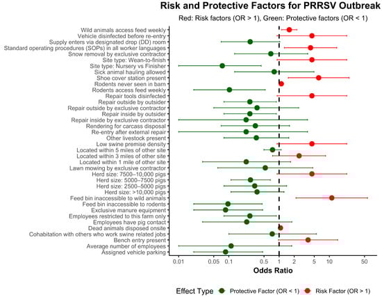 Risk factors associated with PRRS outbreaks. The forest plot displays the odds ratios for various biosecurity and management practices associated with PRRS outbreaks. Practices with odds ratios above 1 indicate increased odds of outbreak (red dots), while those below 1 suggest protective effects (green dots).