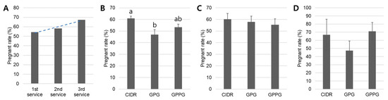 Pregnancy rates by protocol and service number. (A) As the number of inseminations (first, second, and third services) after synchronized ovulation increased, the mean pregnancy rates showed a gradual upward trend (a dashed line). (B) At the first AI, the CIDR protocol resulted in a significantly higher pregnancy rate compared with the GPG protocol, whereas the GPPG protocol produced a pregnancy rate statistically equivalent to the CIDR protocol. (C,D) When cows that failed to conceive after the first AI were resynchronized, no significant differences (p > 0.05) in pregnancy rates among protocols were observed during the second and third AI attempts. Significant differences (p < 0.05) are indicated by different letters above the bars. Graphs are presented as mean (A) or mean ± standard error of the mean (SEM; B–D). Sample sizes: 1st AI—CIDR (214/14), GPG (82/7), GPPG (166/16); 2nd AI—CIDR (52/8), GPG (19/4), GPPG (64/10); 3rd AI—CIDR (9/3), GPG (11/3), GPPG (18/5), where numbers indicate total animals/independent trials.