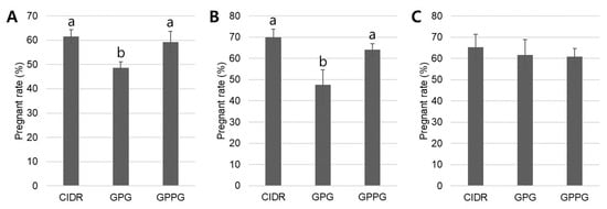 Pregnancy rates by protocol and parity. (A) In nulliparous heifers, pregnancy rates were significantly higher in the CIDR and GPPG groups compared with the GPG group. (B) In young cows, pregnancy rates were also significantly higher in the CIDR and GPPG groups than in the GPG group. (C) In mature cows, protocol selection did not significantly (p > 0.05) affect pregnancy outcomes. Significant differences (p < 0.05) are indicated by different letters above the bars. Graphs are presented as mean ± SEM. Sample sizes: nulliparous heifers—CIDR (127/18), GPG (72/9), GPPG (121/15); young cows—CIDR (66/13), GPG (23/4), GPPG (89/16); mature cows—CIDR (51/9), GPG (15/3), GPPG (22/4), where numbers indicate total animals/independent trials.