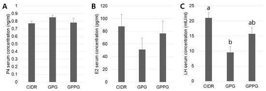 Reproductive hormone levels by protocol. (A) On the day of AI, the GPG protocol group showed a tendency toward higher blood P4 concentrations compared with the other two groups (p > 0.05). (B) E2 concentrations tended to be higher in the CIDR and GPPG groups compared with the GPG group (p > 0.05). (C) The CIDR protocol induced significantly higher blood LH concentrations compared with the GPG protocol. Significant differences (p < 0.05) are indicated by different letters above the bars. Graphs are presented as mean ± SEM. Abbreviations: P4, progesterone; E2, estradiol; LH, luteinizing hormone. Sample sizes: n = 40 for CIDR, n = 28 for GPG, and n = 48 for GPPG.