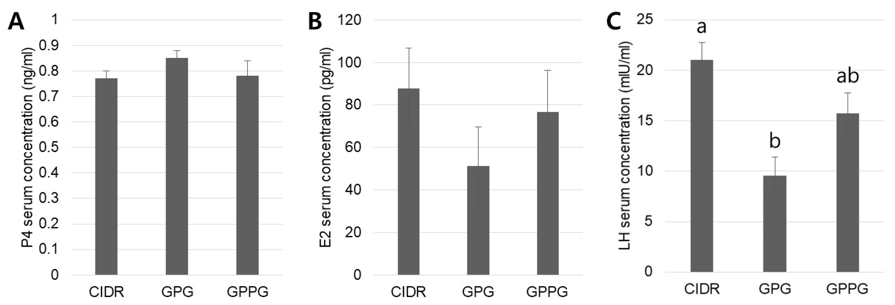 Figure 4. Reproductive hormone levels by protocol. (A) On the day of AI, the GPG protocol group showed a tendency toward higher blood P4 concentrations compared with the other two groups (p > 0.05). (B) E2 concentrations tended to be higher in the CIDR and GPPG groups compared with the GPG group (p > 0.05). (C) The CIDR protocol induced significantly higher blood LH concentrations compared with the GPG protocol. Significant differences (p < 0.05) are indicated by different letters above the bars. Graphs are presented as mean ± SEM. Abbreviations: P4, progesterone; E2, estradiol; LH, luteinizing hormone. Sample sizes: n = 40 for CIDR, n = 28 for GPG, and n = 48 for GPPG.