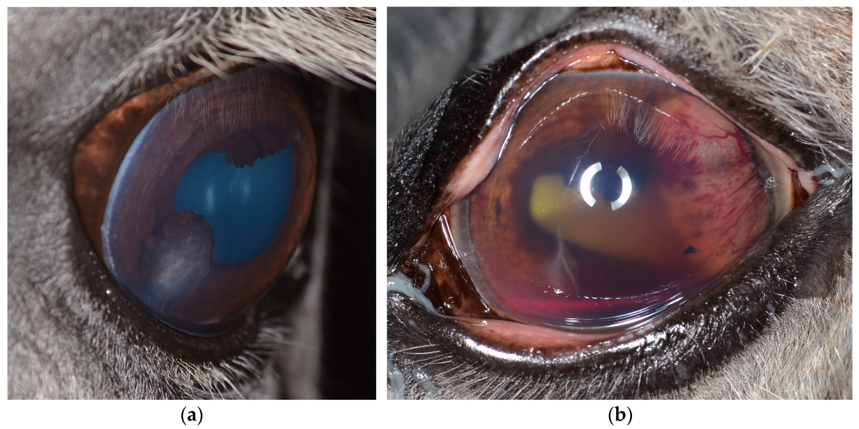 - Gelatt, K.N.; Gelatt, J.P.; Plummer, C.E. (Eds.) Equine Ophthalmic Surgery. In Veterinary Ophthalmic Surgery, 2nd ed.; Elsevier: Amsterdam, The Netherlands, 2022; pp. 365–370. ISBN 978-0-7020-8163-7. [Google Scholar]
