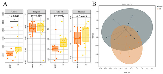 The Chao1 index in the HF group was significantly higher than that in the CON group (p < 0.05; Figure 1A). No significant differences were observed in the Simpson, Faith_pd, and Shannon indices between the two groups (p > 0.05). Non-metric multidimensional scaling (NMDS) was used to analyze the β-diversity of the microbiota, and the stress value of 0.214 indicated that the ordination results were reliable. Microbiota structures in the CON and HF groups were not significantly different (Figure 1B).