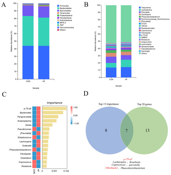 The dominant microbiota at the phylum level in the CON and HF groups were Firmicutes, Bacteroidetes, Spirochaetes, Tenericutes, Proteobacteria, Fibrobacteres, Actinobacteria, TM7, WPS-2, and Verrucomicrobia (relative abundance, p > 1%; Figure 2A). Figure 2B shows the top 20 genera in relative abundance at the genus level in the CON and HF groups. Figure 2C shows the top 15 genera ranked by importance, calculated using the random forest algorithm at the genus level, for both groups. Figure 2D shows a Venn diagram of the intersection between the top 20 genera in relative abundance and the top 15 genera in importance at the genus level. As shown in Figure 2D, the overlapping genera were p-75-a5, Lachnospira, Roseburia, Fibrobacter, Phascolarctobacterium, Coprococcus, and Prevotella.