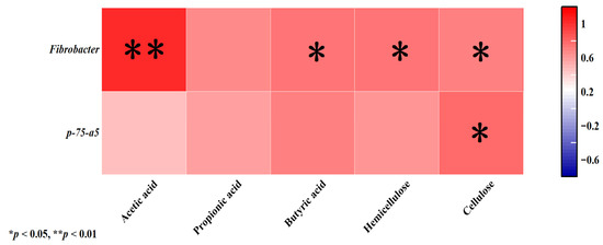 Fibrobacter showed a highly significant positive correlation with acetic acid (p< 0.01) and was significantly associated with butyric acid, cellulase, and hemicellulase (p < 0.05). p-75-a5 exhibited a significant positive correlation with cellulose (p < 0.05; Figure 3).