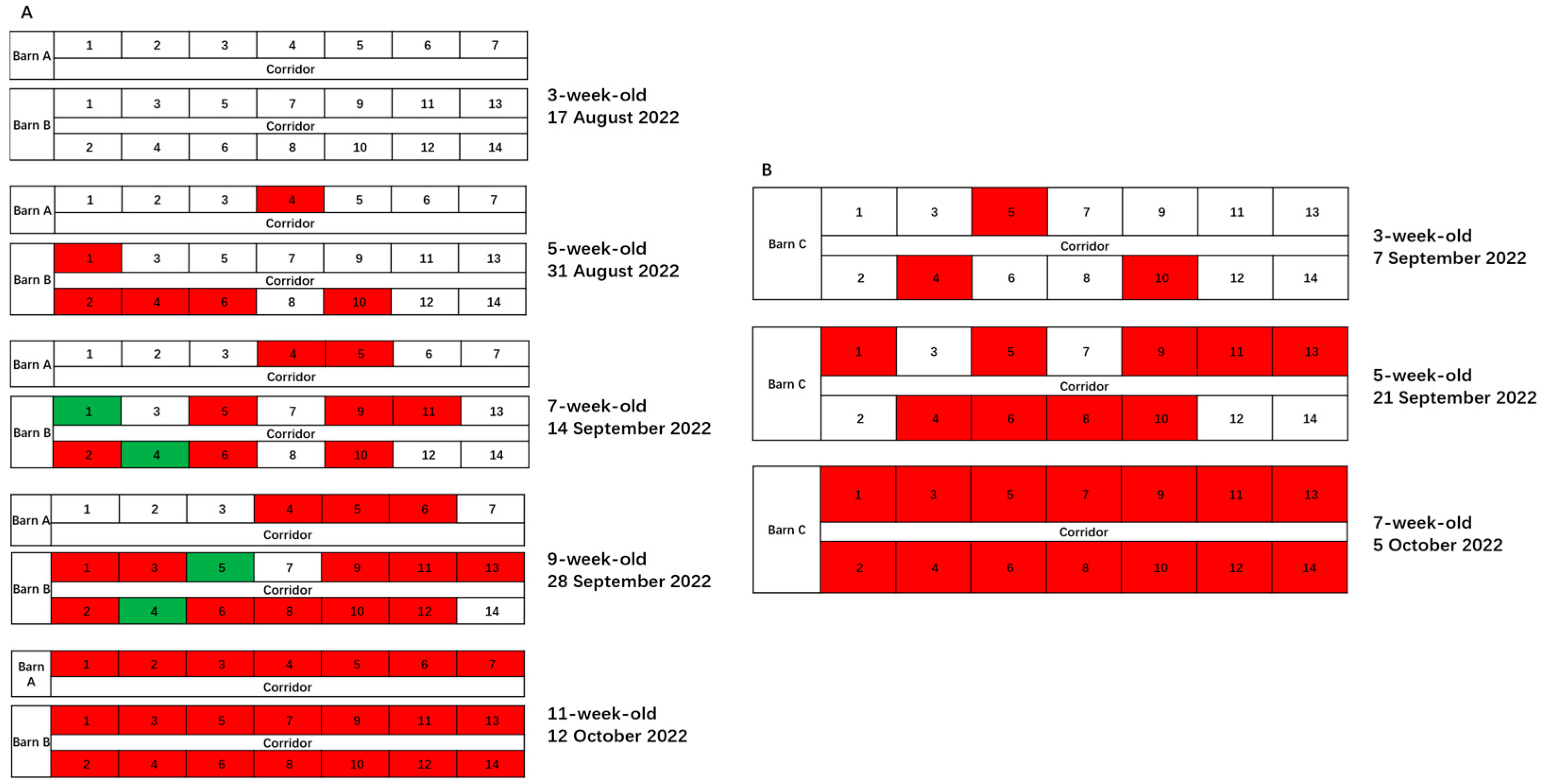 - Hu, R.; Zhang, T.; Lai, R.; Ding, Z.; Zhuang, Y.; Liu, H.; Cao, H.; Gao, X.; Luo, J.; Chen, Z.; et al. Prrsv Elimination in a Farrow-to-Finish Pig Herd Using Herd Closure and Rollover Approach. Viruses 2023, 15, 1239. [Google Scholar] [CrossRef]