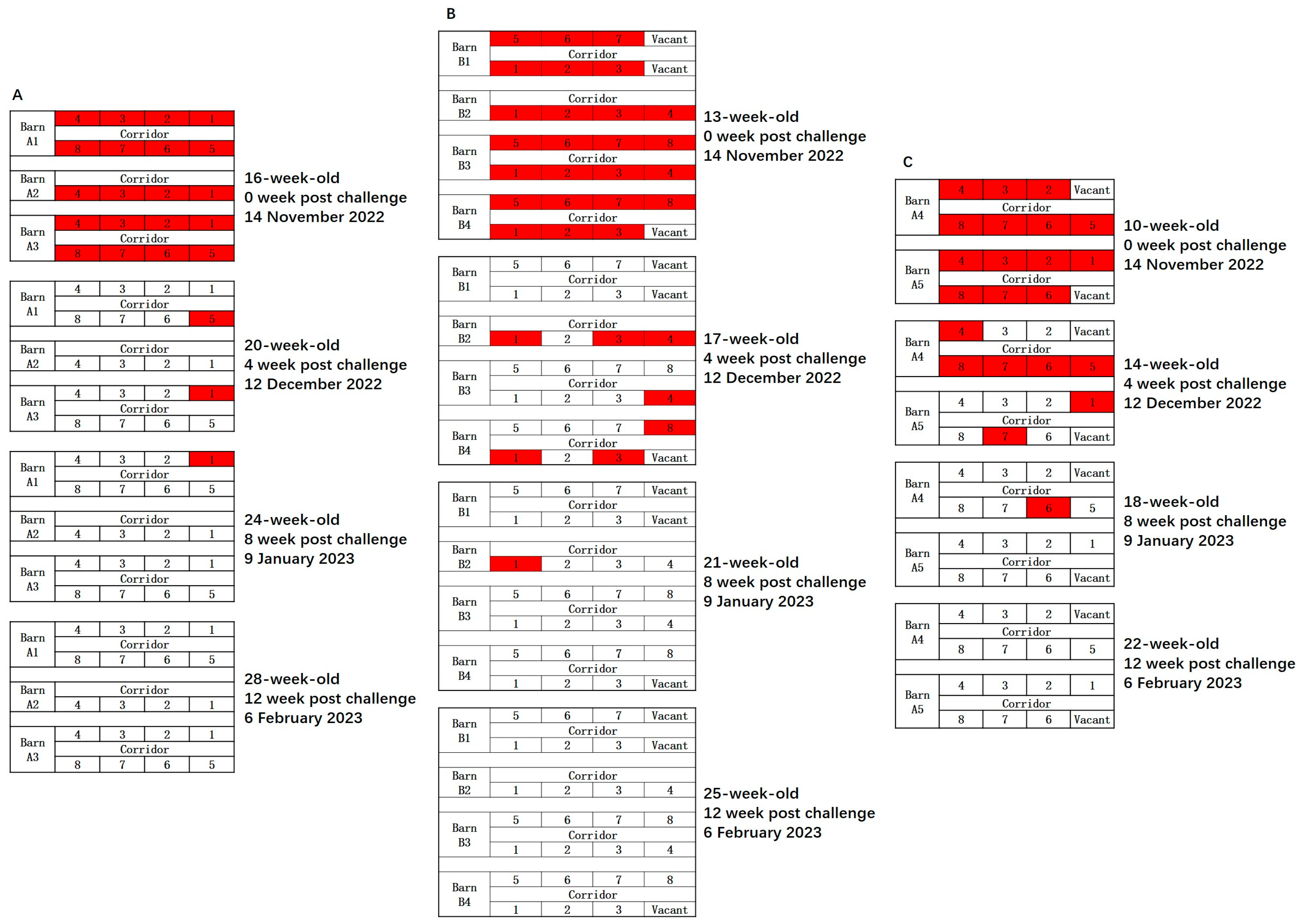 | OF | All pens | PCR | 12–24 h after challenge | Evaluating intervention efficiency |