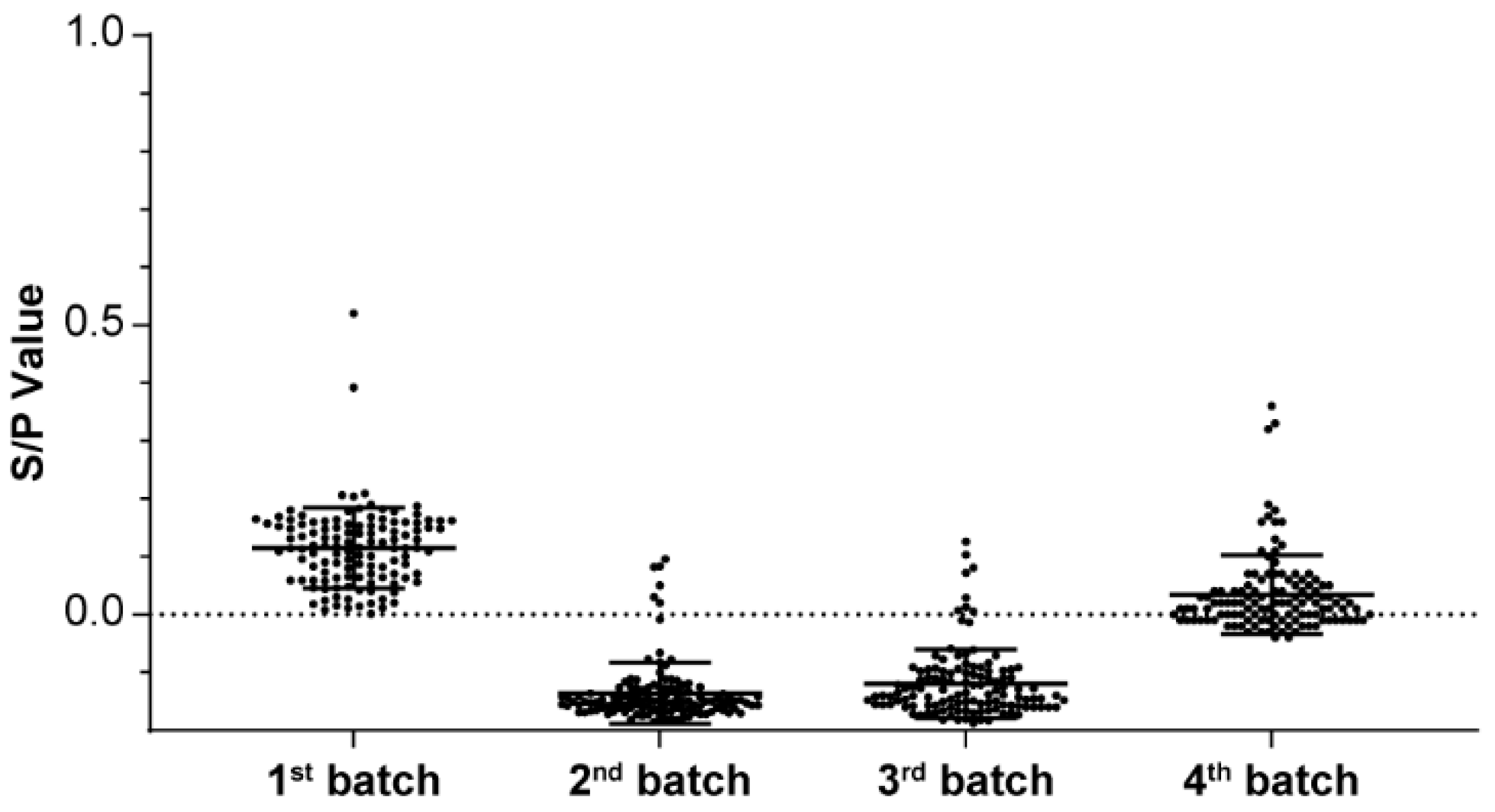 | Batch | Mean S/P Value | No. of Positive Samples | No. of Samples | Percentage of Positive Samples |