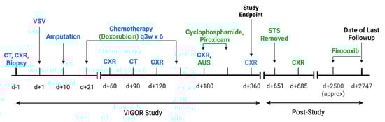 Based on the diagnosis of bone HSA, the chemotherapy regimen was changed from carboplatin to doxorubicin. The dog received six doses of doxorubicin three weeks apart at the conventional dose of 30 mg/m2, with the exception of dose number four, which required a dose reduction to 27 mg/m2. Two months after the last doxorubicin dose, recheck thoracic radiographs and abdominal ultrasound were negative for metastasis. The dog began metronomic chemotherapy with 15 mg/m2 cyclophosphamide and 0.3 mg/kg piroxicam, with the cyclophosphamide eventually discontinued. The formal period of follow-up for the VIGOR Study was one year after treatment, after which continued diagnostic testing was at the discretion of the owner and the primary veterinarian. Approximately 17 months after the last dose of doxorubicin, the dog developed a grade I soft tissue sarcoma of the right eyelid that was incompletely excised. Approximately 18 months after the last dose of doxorubicin, which was almost two years after VSV treatment, the dog presented to the University of Minnesota Veterinary Medical Center emergency department for gastrointestinal signs and anorexia. Abdominal and thoracic radiographs taken at that time were negative for metastasis. At the time of writing, seven years after his initial treatment, the dog remains alive and is reported by the owner to be clinically performing well. The dog is reported to be receiving firocoxib (4 mg/kg once daily) for presumed osteoarthritis. Additional diagnostic testing has not been pursued. A timeline of key events in the VIGOR study and the patient’s available follow-up period is shown in Figure 3.