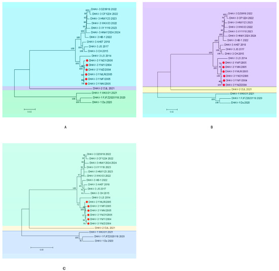 Phylogenetic analyses based on the whole genome, ORF, and VP1 sequences (Figure 2) demonstrated that all six strains cluster within the same evolutionary branch of DHAV-3, suggesting a common ancestral origin. These strains showed the closest relationship with the DHAV-3 LS strain reported in 2014, grouping within the same evolutionary cluster. They formed distinct subclades alongside the 2018 DHAV-3 AH07, 2017 DHAV-3 JS, and 2015 CH strains within this branch. Although positioned on the same branch as the reference strains from 2022, 2023, and 2024, the six isolates are relatively distant from these recent strains, indicating ongoing genomic variation among DHAV-3 strains in recent years.