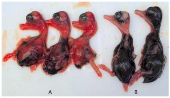Clinical symptoms of duck embryos. ((A): challenge group; (B): control group).