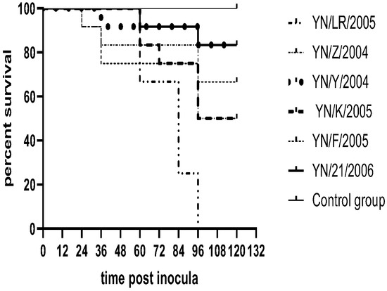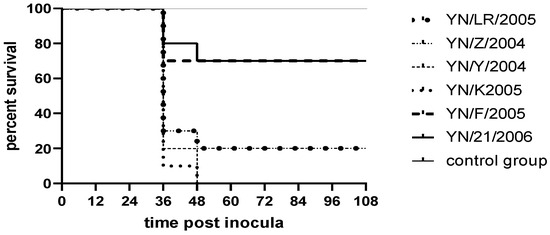 Following inoculation, ducklings exhibited clinical signs including lethargy, depression, reduced appetite, and, in some cases, ataxia. Deceased ducklings showed opisthotonos (Figure 5). Clinical symptoms appeared as early as 12 h post-inoculation, with mortality occurring within 48 h. Necropsy of deceased individuals revealed hepatomegaly with punctate and brush-like hemorrhages, as well as punctate hemorrhages in the kidneys. In contrast, control ducklings maintained normal mental status and feeding behavior, with no significant pathological changes observed upon necropsy (Figure 6). Survival curves for the infected ducklings were generated using the Kaplan–Meier method and plotted with GraphPad Prism 8 (Figure 7). Most strains (YN/LR/2005, YN/Z/2004, YN/K/2005) exhibited significant differences in pathogenicity toward ducklings and duck embryos (all p-values were far less than 0.05) (Table 5).