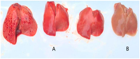 Histopathological examination of liver tissues from deceased ducklings revealed extensive lymphocytic infiltration within inflamed areas. Microscopic observation showed erythrocyte rupture due to hemorrhage, accompanied by deposition of golden-yellow pigments. Additionally, pronounced hepatic steatosis was evident, characterized by intracellular vacuolization, reflecting typical hepatic injury. In contrast, liver tissues from the control group exhibited intact cellular architecture with no observable pathological alterations (Figure 11).