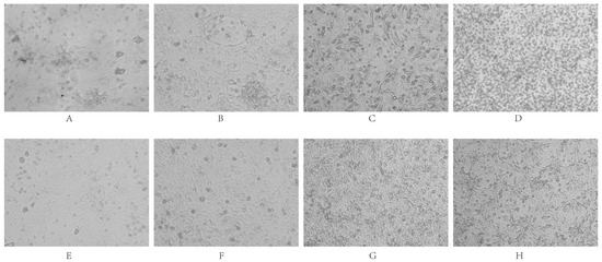 Cytopathic effects of viral infection. DEF cells (Panels (A): infected group; (E): control group) exhibited clustered infection, followed by filament and network formation, ultimately leading to cell disintegration and death. DEK cells (Panels (B): infected; (F): control) showed clustered infected cells with widened intercellular spaces; single-layer cells formed filaments and networks before detaching. BHK-21 cells (Panels (C): infected; (G): control) displayed widened intercellular spaces, cell rounding, and desquamation. Vero cells (Panels (D): infected; (H): control) demonstrated enlarged intercellular spaces accompanied by numerous rounded cells and desquamation.