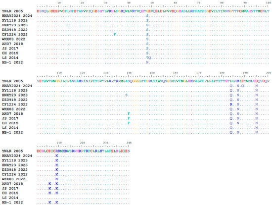 Sequence alignment revealed that the nucleotide sequence identity among all six strains exceeded 99.5%, with amino acid sequence identity above 99.6%. Compared to recently identified strains in China—HNAY2024 (2024) and XY1118 and HNXY23 (2023)—nucleotide sequence identity ranged from 95.5% to 95.7%, while amino acid sequence identity ranged from 98.2% to 98.6%. For strains isolated in 2022, including DZ0918, CF1224, WKX03, and HB-1, nucleotide sequence similarity ranged from 95.3% to 95.9%, and amino acid similarity ranged from 98.3% to 98.6%. The highest nucleotide sequence similarity was observed with the LS strain identified in China in 2014, ranging from 97.1% to 97.3%, with amino acid sequence similarity between 98.8% and 98.9% (Table 4).