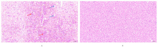 Histopathological lesions in liver tissue (20× magnification). (A) Experimental group showing extensive hepatic steatosis (Blue arrow) characterized by numerous round cytoplasmic vacuoles of varying sizes, hemorrhage (Red arrow). (B) Control group exhibiting normal liver histology with no observable pathological changes.