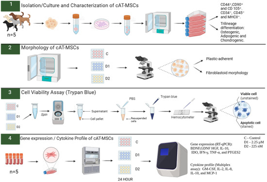 Experimental design. Canine adipose tissue-derived mesenchymal stem cells (cAT-MSCs) were thawed and cultured in 75 cm2 flasks. Upon reaching 80% confluence, the cells were plated in 24-well plates and primed with a Cannabidiol (CBD)-rich cannabis extract at two concentrations (2.25 µM and 225 nM). After 24 h of priming, cell viability was assessed using the 0.4% Trypan Blue test, and morphology was evaluated using an inverted microscope. Subsequently, the expression of neurotrophic factors, cytokines, and immunomodulatory genes was analyzed by RT-qPCR, and cytokine levels in the conditioned medium were quantified using a Multiplex Assay. PBS: phosphate-buffered saline. C: Control. D1: dose 1 (2.25 µM). D2: dose 2 (225 nM). BDNF: brain-derived neurotrophic factor. GDNF: glial cell line-derived neurotrophic factor. HGF: hepatocyte growth factor. IL-10: interleukin-10. IDO: Indoleamine 2,3-dioxygenase. IFN-γ: interferon-gamma. TNF-α: tumor necrosis factor-alpha. PTGES2: prostaglandin E2 synthase 2. GM-CSF: granulocyte-macrophage colony-stimulating factor. IL-2: interleukin-2. IL-8: Interleukin-8. MCP-1: monocyte chemoattractant protein-1. Created in BioRender. Amorim, R. (2025) https://BioRender.com/2q4ca6a, accessed on 19 September 2025.
