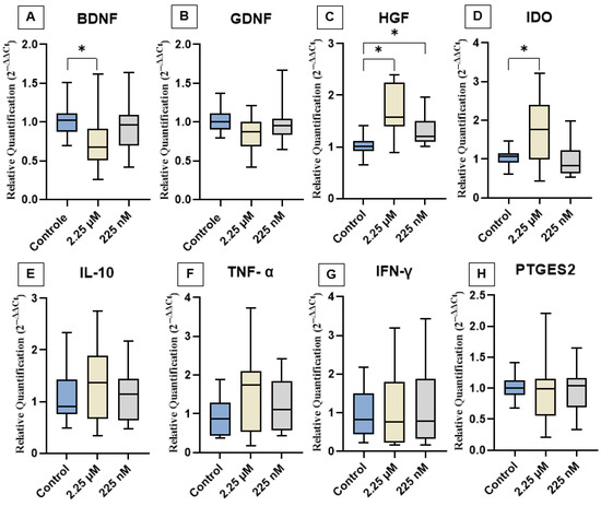 Relative expression of neurotrophic factors, immunomodulatory genes, and cytokines among the experimental groups. (A) BDNF, (B) GDNF, (C) HGF, (D) IDO, (E) IL-10, (F) TNF-α, (G) IFN-γ, and (H) PTGES2. Data are represented as medians, interquartile ranges, and minimum and maximum values (* p < 0.05). Kruskal–Wallis and Dunn’s tests. BDNF: Brain-derived neurotrophic factor; GDNF: Glial cell line-derived neurotrophic factor; HGF: Hepatocyte growth factor; IDO: Indoleamine 2,3-dioxygenase; IL-10: Interleukin-10; TNF-α: Tumor necrosis factor-alpha; IFN-γ: Interferon-gamma; PTGES2: Prostaglandin E synthase 2.