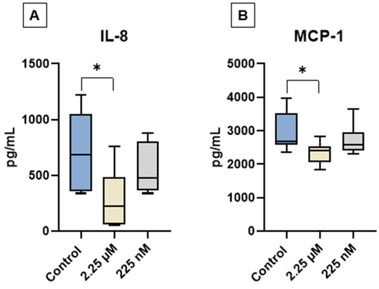 Quantification of interleukin-8 (IL-8) and monocyte chemoattractant protein-1 (MCP-1) in the conditioned medium of canine adipose tissue-derived mesenchymal stem cells (cAT-MSCs) after priming with a CBD-rich cannabis extract. (A) IL-8 and (B) MCP-1 levels. Data are represented as medians, interquartile ranges, and minimum and maximum values (* p < 0.05). Kruskal–Wallis and Dunn’s tests.