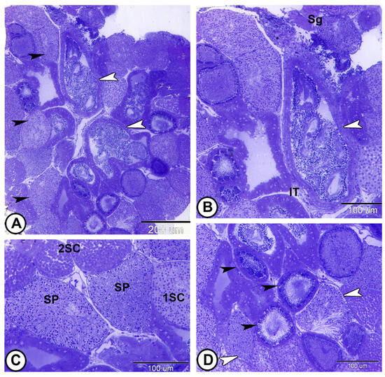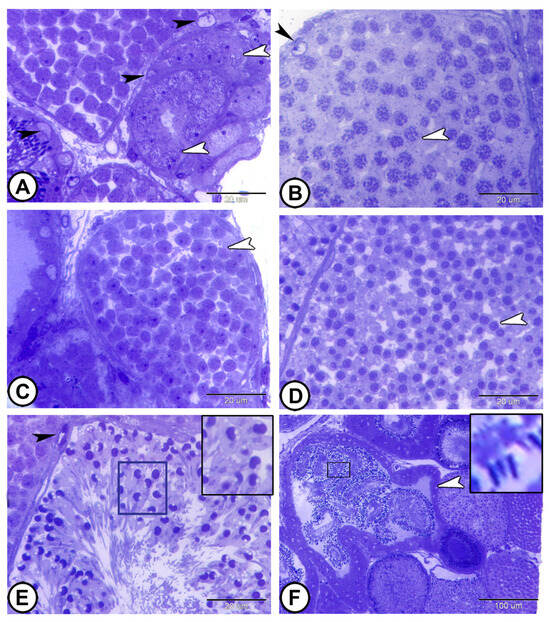 - Torres-Martínez, A.; de Dios, L.R.; Hernández-Franyutti, A.; Uribe, M.C.; Sánchez, W.C. Structure of the testis and spermatogenesis of the viviparous teleost Poecilia mexicana (Poeciliidae) from an active sulfur spring cave in Southern Mexico. J. Morphol. 2019, 280, 1537–1547. [Google Scholar] [CrossRef]