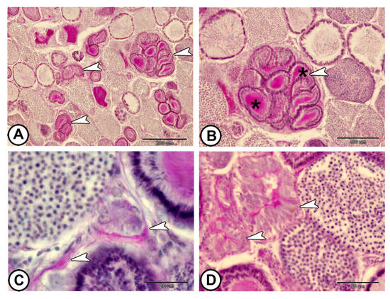 - Grier, H.J.; Aranzabal, M.C.U. The testis and spermatogenesis in teleosts. In Reproductive Biology and Phylogeny of Fishes (Agnathans and Bony Fishes); CRC Press: Boca Raton, FL, USA, 2009; pp. 119–142. [Google Scholar]