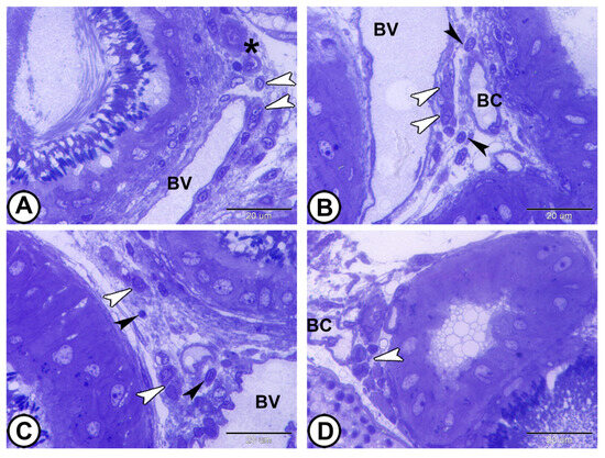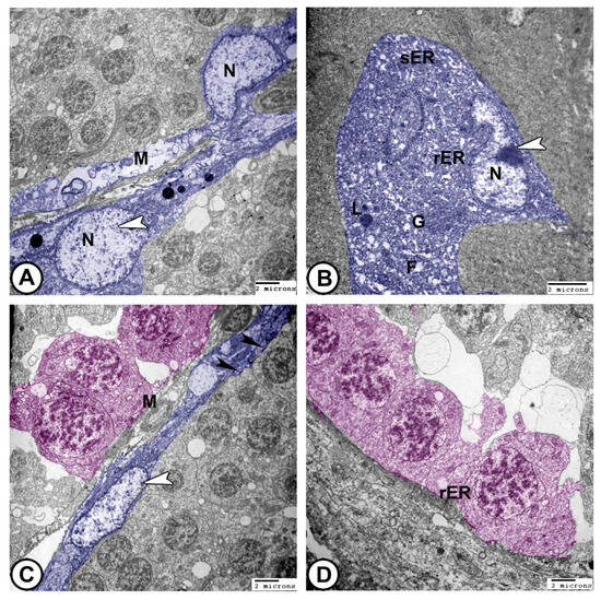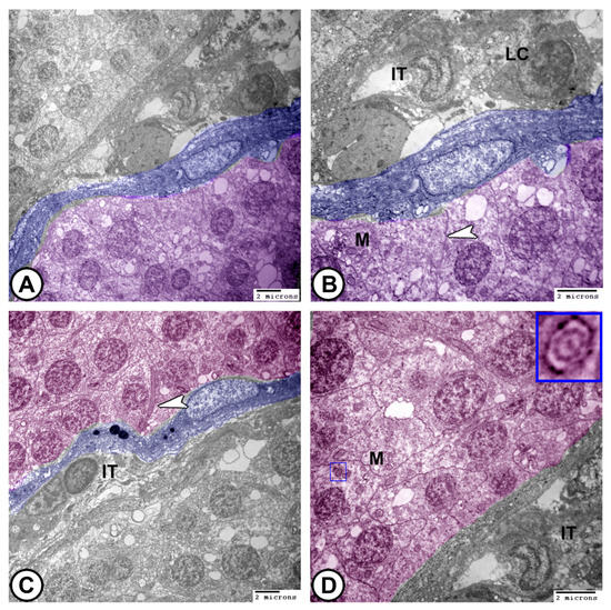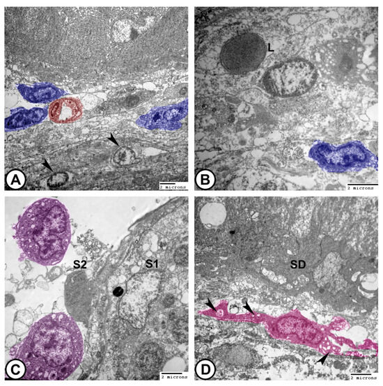 - Interstitial tissues contained Leydig cells around the blood capillaries that were characterized by abundant smooth endoplasmic reticulum, lipid droplets, few lysosomes, and mitochondria, in addition to fibroblasts (Figure 11A,B). Macrophages appeared as irregular-shaped cells with large lysosomes, phagosomes, and pseudopodia (Figure 11C). Telocytes were present in the interstitum and were characterized by a spindle body and telopodes containing secretory vesicles (Figure 11D).