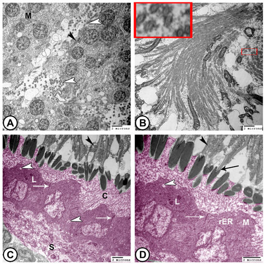 - Spermatids: These typically have a spherical, electron-dense nucleus with unevenly dispersed chromatin was observed in the cells. Numerous mitochondria were arranged in the cytoplasm close to the nucleus, while the endoplasmic reticulum′s cisternae were dispersed throughout the cytoplasm. The flagellum was composed of microtubules arranged in a distinctive “9 + 2” pattern, with nine microtubule doublets surrounding a central pair that were encased in the plasma membrane (Figure 9C,D and Figure 10A).