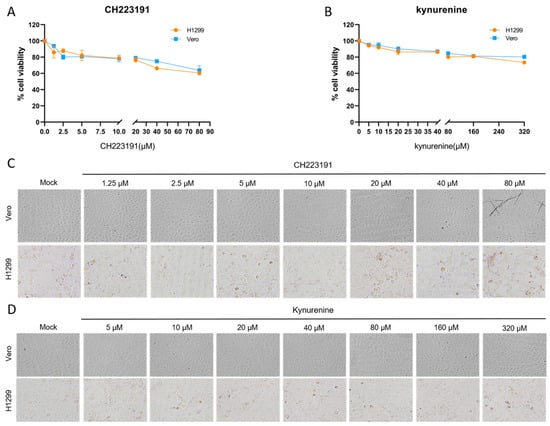 CH223191 induced significant cytotoxicity in H1299 cells at 80 µM, accompanied by cell rounding and membrane blebbing, while Vero cells exhibited only a mild reduction in viability without apparent morphological alterations (Figure 1A,C). Kynurenine exhibited no toxicity in either cell line (Figure 1B,D).