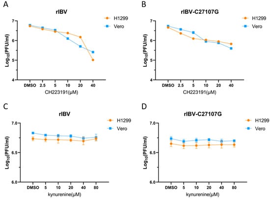 To investigate AhR-mediated pharmacological modulation during IBV infection, Vero and H1299 cell cultures were treated with dimethyl sulfoxide (vehicle), CH223191 (2.5 µM, 5 µM, 10 µM, and 20 µM), or kynurenine (5 µM, 10 µM, 20 µM, and 40 µM), administered during pre- and post-infection phases. Recombinant IBV strains (rIBV and rIBV-C27107G) were inoculated at MOI of 0.5, with viral titers determined by PFU quantification following 48 h supernatant collection (Figure 2).