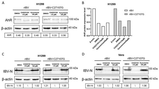 Effects of CH223191 and kynurenine on AhR and IBV-N protein expression levels. H1299 (A,C) and Vero (D) cells were pretreated with CH223191 or kynurenine, respectively, and subsequently infected with either rIBV or the mutant strain rIBV-C27107G (MOI of 0.5) for a duration of 48 h. The protein expression levels of AhR and IBV-N were analyzed using Western blotting. (B) Quantitative assessment of AhR protein expression normalized to β-actin levels.