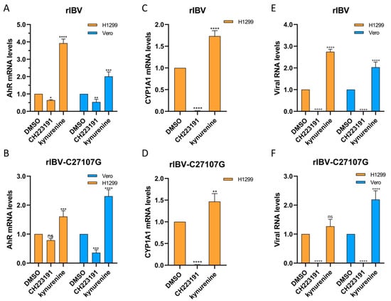 Modulatory effects of CH223191 and kynurenine on expression levels of target genes in virus-infected Vero and H1299 cells. H1299 and Vero cells were pre-treated with either CH223191 or kynurenine, followed by infection with rIBV (A,E) or rIBV-C27107G (B,F) for a duration of 48 h. The mRNA expression levels of AhR (A,B), CYP1A1 (C,D), and IBV-N (E,F) were quantified using qRT-PCR. Bar graphs illustrate the relative expression ratios (2−ΔΔCt) of the target genes in compound-treated groups normalized to the DMSO control group, with GAPDH used as the endogenous reference gene. Results were plotted as the mean ± SD. p < 0.05 was considered statistically significant. ns, p > 0.05, non-significant; * p < 0.05; ** p < 0.01; *** p < 0.001; **** p < 0.0001.