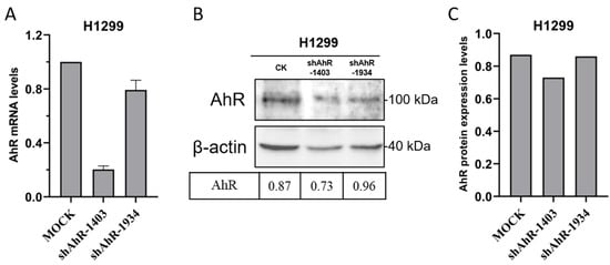 To investigate the role of endogenous AhR in IBV replication, we constructed two short hairpin RNAs (shRNAs) targeting human AhR mRNA (shAhR-1403: 5′-GCTTTGTTTGCGATAGCTACT-3′; shAhR-1934: 5′-GCTACCACATCCACTCTAAGC-3′). These shRNAs were cloned into a pLKO.1-GFP lentiviral vector using BamHI and EcoRI restriction sites (New England Biolabs, Inc., Ipswich, MA, USA). In transfected cells, AhR mRNA and protein levels were significantly reduced (Figure 5), with shAhR-1403 showing highest silencing efficiency and selected for subsequent studies.