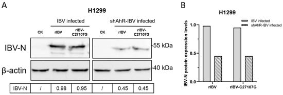 Impact of AhR knockdown on IBV-N protein expression. (A) Western blot analysis was performed on H1299 cells transduced with shAhR-1403 and subsequently infected with dual-strain rIBV/rIBV-C27107G (MOI of 0.5) for 48 h. (B) Quantitative densitometric analysis of IBV-N protein expression was conducted, with results normalized to β-actin levels.
