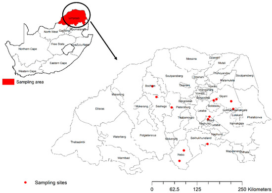 Map of South Africa indicating Limpopo province and sampling area in red dots.