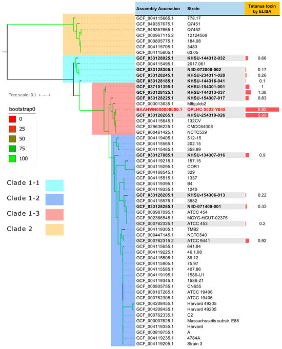 - Shitada, C.; Sekizuka, T.; Yamamoto, A.; Sakamoto, C.; Hashino, M.; Kuroda, M.; Takahashi, M. Comparative pathogenomic analysis reveals a highly tetanus toxin-producing clade of Clostridium tetani isolates in Japan. mSphere 2023, 8, e0036923. [Google Scholar] [CrossRef] [PubMed]