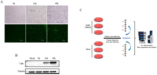 In our previous study, the PoRV strain AHBZ2304 (G9P[23]) was exhibited to be highly pathogenic for newborn piglets, with gut microbiota dysbiosis and inflammatory cytokine overexpression identified as key contributors to intestinal pathogenesis [11]. Although extensive research has elucidated the rotavirus life cycle, limited studies were focused on the pathogenic mechanisms and immunomodulation of porcine rotavirus. Host transcriptomic and proteomic alterations commonly occur during viral infection, offering critical insights into these processes. For instance, Raque et al. conducted comparative transcriptome responses of G5P[7] and G9P[13] PoRVA strains in porcine ileal enteroids (PIEs), revealing immune response activation and cholesterol metabolism modulation as pivotal host responses [12]. Similarly, Raev et al. revealed antiviral factors that may be the mechanisms responsible for the unique rotavirus C characteristics through transcriptome analysis [13]. Compared to transcriptome, proteomics is likely to be more effective for the comprehensive analysis of host cellular responses to viral infections. Lv et al. performed proteomic analysis upon porcine endemic diarrhea virus (PEDV) infection and demonstrated that differentially abundant proteins (DAPs) were involved in immune response regulation, signal transduction, lipid transport, and metabolism processes as well as cell apoptosis pathways [14]. Further studies by Shen et al. and Huang et al. characterized the proteomic alterations of exosome and membrane during PEDV infection, respectively, uncovering roles for exosome-mediated signaling and PARD3 in viral pathogenesis [15,16]. Guo et al. expanded the work by comparing proteomic signatures of virulent and CV777 vaccine strain-like PEDV strains [17]. However, proteomic investigations of PoRV remain scarce.