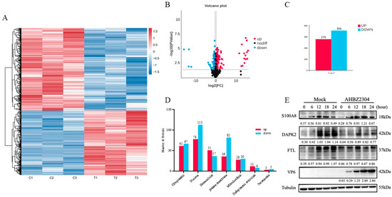 Identification and validation of proteomics data. (A) Hierarchical clustering analysis of DAPs. Relative expression level of DAPs is represented as color range from low level (blue) to high level (red). (B) Volcano plot of DAPs. Unchanged, up-abundant, and down-abundant proteins were represented by dark red and blue points, respectively. (C) The data statistics of DAPs with AHBZ2304 infection. (D) Subcellular localization prediction of DAPs in IPEC-J2 cells during AHBZ2304 infection. (E) Confirmation of DAPs by Western blot analysis. Western blot analysis of the SA100A8, DAPK2, and FTL protein expression levels in AHBZ2304- or mock-infected IPEC-J2 cells at 6 HPI, 12 HPI, 18 HPI, and 24 HPI (MOI = 1). Tubulin was used as a loading control. The intensity ratio between the corresponding bands (PoRV-infected/mock band) was measured by densitometric scanning and normalized to the intensity of the Tubulin bands in each experiment.