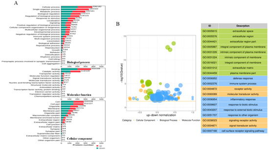 Gene Ontology (GO) annotation analysis of DAPs identified in IPEC-J2 cells with AHBZ2304 infection. (A) The proteins were annotated into biological process (BP), cellular component (CC), and molecular function (MF). The ordinate text indicates the name and classification of GO terms. The red and green columns represent the up-abundant and down-abundant proteins, respectively, with the number of altered proteins being marked on top of each column. (B) The bubble plots of Gene Ontology and top 20 of GO term.