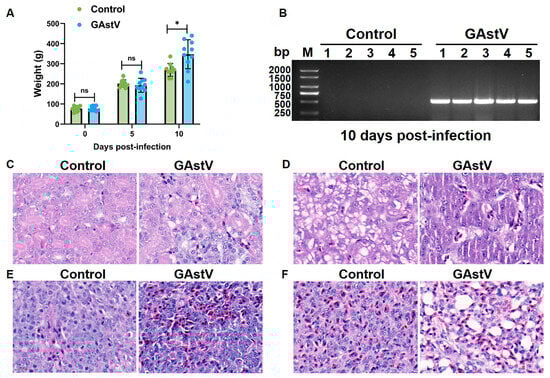 Body weight and histopathological change in GAstV-infected Jiangnan white goslings. (A) Body weight of un-infected/infected goslings at day 0, 5, and 10 post-infections. (B) RT-PCR amplification results of GAstV ORF2 detected in infected kidneys compared to controls. H&E staining results of the kidney (C), liver (D), spleen (E), and lung (F) from GAstV-infected Jiangnan white goslings at day 10 post-infection.