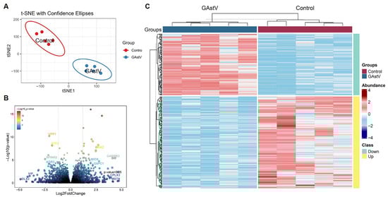 Transcriptome profiling of Jiangnan white goslings during GAstV infection. (A) The non-linear T-distributed stochastic neighbor embedding (t-SNE) dimensionality reduction algorithms clustered individual samples. (B) Volcano plot shows the distribution of significantly altered genes detected in infected kidneys compared to controls. (C) Heatmap of 342 DGEs in infected kidneys compared to controls.