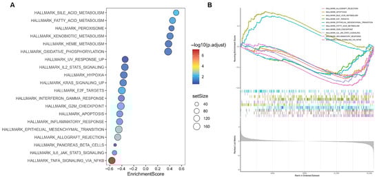 Gene set enrichment analysis is a computational method that determines whether an a priori defined set of genes shows statistically significant, concordant differences between two biological states (e.g., phenotypes) [,]. Hallmark gene sets from the Molecular Signatures Database (MSigDB v2023.1) were applied to perform GSEA by the GSEA software (version 4.0.3) on all expressed genes in GAstV-infected Jiangnan white goslings.