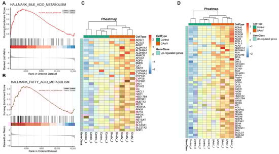 Bile acid and fatty acid metabolism pathways of GAstV-infected Jiangnan white gosling kidneys. (A) GSEA map of bile acid metabolism. (B) GSEA map of fatty acid metabolism. (C) Heatmap of upregulated genes from bile acid metabolism. (D) Heatmap of upregulated genes from fatty acid metabolism.