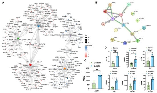 AGXT-centered bile acid metabolic dysregulation in GAstV-infected Jiangnan white goslings. (A) Interaction network map of dysregulated genes from the 5 significant enriched pathways. (B) PPI network map of dysregulated genes in the bile acid metabolism centered on AGXT. (C) Relative expression of AGXT gene in the kidney of GAstV-infected Jiangnan white goslings. (D) Relative expression of six genes (PIPOX, ALDH1A1, CAT, AQP9, APOA1, and SLC23A1) in the kidney of GAstV-infected Jiangnan white goslings.