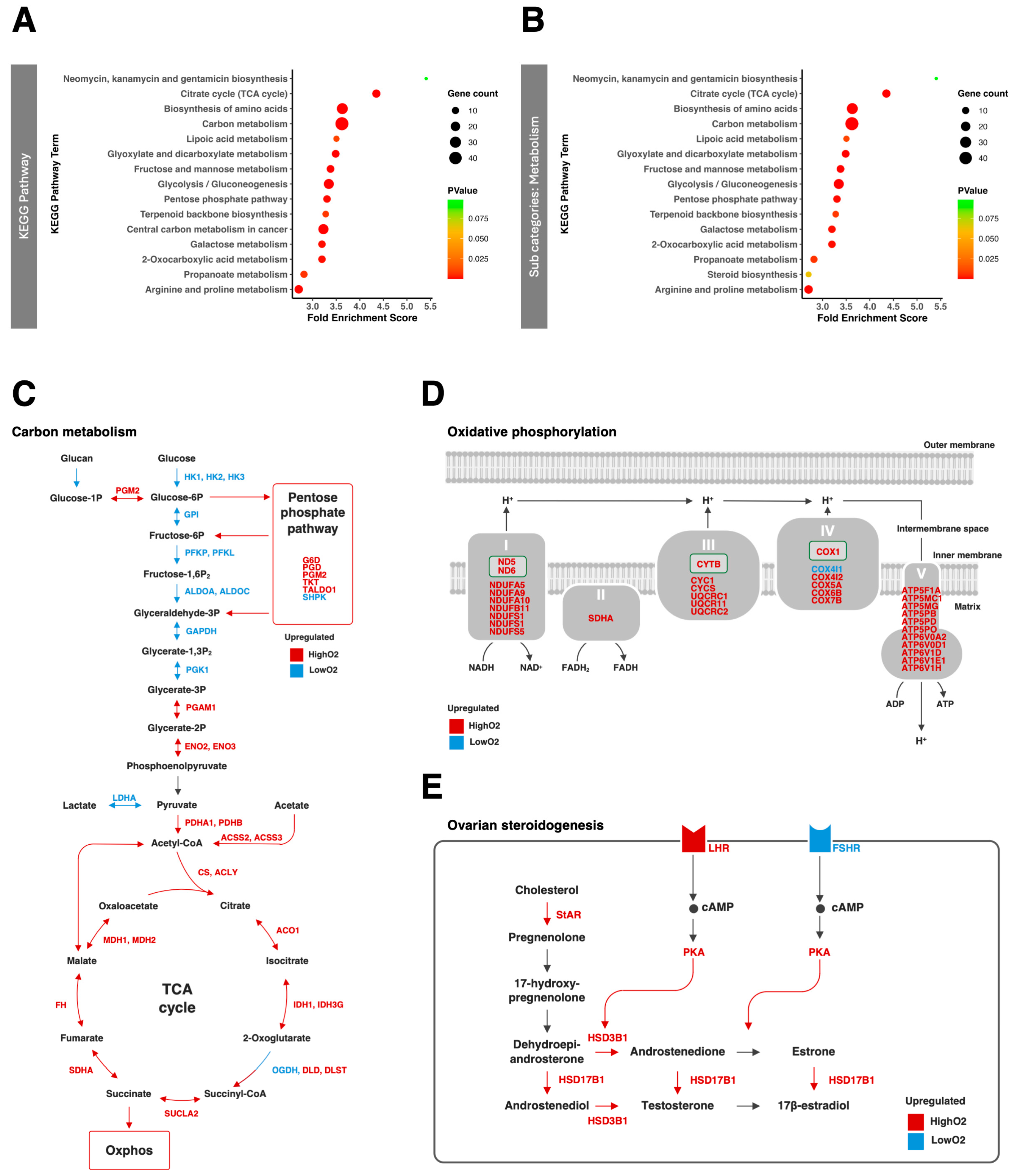 Figure 4. The RNA-seq of the cumulus cells. The top 15 KEGG pathways analysis (A) and subcategories of metabolism (B). The pathways were enriched by the differentially expressed genes with fold enrichment score (color scale: fold enrichment score; dot size: gene counts). (CE) show expression of genes (blue: upregulated by LowO2 condition; red: downregulated by LowO2 condition) regarding carbon metabolism (C), oxidative phosphorylation (D) and ovarian steroidogenesis (E).