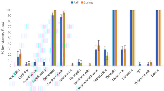 Percentages of lagoon samples with antimicrobial-resistant Escherichia coli categorized by season (n = 75). Lagoon samples were collected from 9 California dairies at 4- to 5-week intervals during the Fall/Winter (Fall) and Winter/Spring (Spring) seasons. A total of 10 samples were collected per dairy over the I year study period. Error bars represent one standard error of the mean. * TS refers to Trimethoprim Sulfamethoxazole.