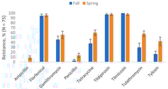 Percentages of lagoon samples with antimicrobial-resistant Enterococcus spp./Streptococcus spp. categorized by season (n = 82). Lagoon samples were collected from 9 California dairies at 4- to 5-week intervals during the Fall/Winter (Fall) and Winter/Spring (Spring) seasons. A total of 10 samples were collected per dairy over the one-year study period. Error bars represent one standard error of the mean.
